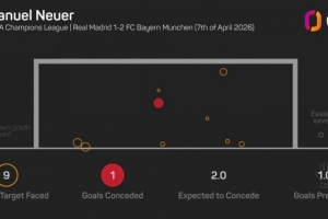 拜仁門將諾伊爾本場比賽做出9次撲救,他是有相關(guān)統(tǒng)計以來,首位在客戰(zhàn)皇馬的歐冠淘汰賽中做出9次撲救的門將。