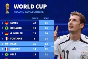 體育資訊4月2日訊 德轉列世界杯歷史射手榜,克洛澤、大羅前二,梅西和姆巴佩分居第五位和第六位。