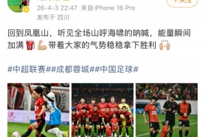 賽后為蓉城首發踢滿全場的胡荷韜更新社媒慶祝勝利,他寫道: