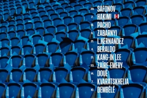 39-薩福諾夫、2-阿什拉夫、51-帕喬、6-扎巴爾尼、21-盧卡斯、4-貝拉爾多、21-李剛?cè)省?3-扎伊爾·埃梅里、14-杜埃、7-克瓦拉茨赫利亞、10-登貝萊