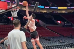 GIF-楊瀚森賽前暴扣,與隊友撞胸
