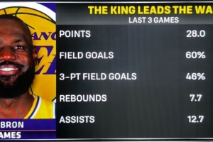 在最近的三場比賽中,詹姆斯場均28分7.7籃板12.7助攻,投籃命中率60%,三分命中率46.2%。