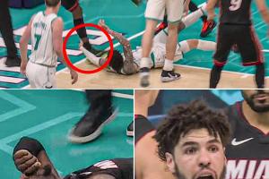 在第二節(jié)的一次進攻倒地后,黃蜂球星拉梅洛·鮑爾順勢抓到了熱火內(nèi)線阿德巴約的腳踝,致使后者失衡重摔在地,隨后返回更衣室。