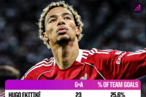 體育資訊4月15日訊 埃基蒂克疑似跟腱受傷將長期缺戰,這對利物浦攻擊力無疑是巨大打擊。OPTA盤點了本賽季利物浦隊內各項賽事參與進球(進球+助攻)情況,具體如下(參與進球+隊內占比)