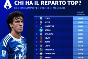意甲各隊(duì)中場球員總身價排行