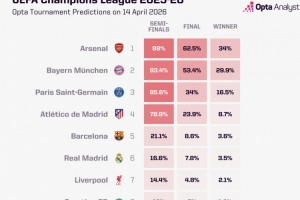 OPTA對(duì)拜仁、阿森納等隊(duì)的晉級(jí)概率進(jìn)行了預(yù)測(cè),拜仁晉級(jí)概率83.4%,阿森納晉級(jí)概率88%,也就是說(shuō)皇馬的晉級(jí)概率僅為16.6%,葡萄牙體育則低至12%。