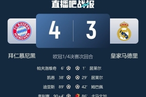 體育資訊4月16日訊 歐冠1/4決賽次回合,拜仁主場4-3逆轉(zhuǎn)擊敗皇馬,并以6-4的總比分晉級四強。