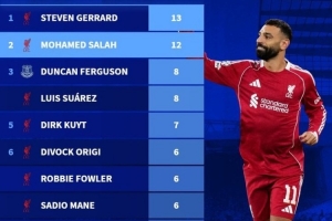 默西賽德郡德比歷史射手榜:杰拉德13球、薩拉赫12球、蘇牙8球