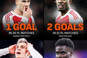 總身價2.35億!阿森納四大邊鋒英超共進14球:薩卡6球馬丁內利1球