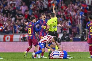 VAR兩次介入成為轉折點:第一次將尼古拉斯?岡薩雷斯的第二張黃牌改判為直接紅牌,對比賽影響有限。第二次則在下半場初段引爆爭議:巴薩球員赫拉德?馬丁拼搶時先觸到球,但隨后踩到了阿爾馬達的腳踝。主裁布斯克茨?費雷爾最初認定這是嚴重犯規,直接出示紅牌。但VAR裁判梅萊羅?洛佩斯持相反意見,示意主裁回看錄像改判。