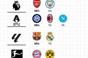 體育資訊04月06日訊 歐洲五大聯賽已經接近賽季尾聲,數據網站Football Rankings根據聯賽分數、近期狀態(tài)、剩余賽程等因素,列出了各聯賽球隊奪冠概率,五大聯賽領頭羊奪冠概率都超過了90%。