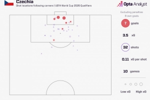 世預(yù)賽歐洲區(qū)比賽,捷克已經(jīng)通過角球打進(jìn)7球,位居歐洲區(qū)所有球隊(duì)之首。