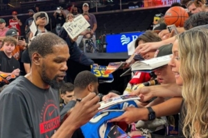 在賽前訓練結束后,杜蘭特為菲尼克斯的球迷們簽名。